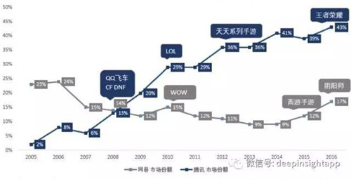 基于公司的財報和艾瑞的數(shù)據(jù),我們做出了兩家公司在游戲市場份額的變化趨勢,2008年是一個明顯的轉(zhuǎn)折點(diǎn),這一年騰訊開始超越網(wǎng)易,2008-2010年三年的時間,騰訊通過LOL、DNF、QQ飛車、CF等爆款把游戲市場份額從6%提高到了接近30%。
