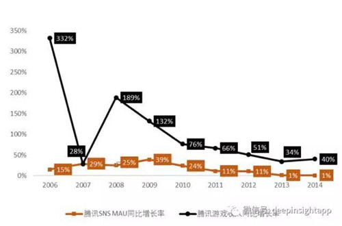 可以看到,騰訊SNS的MAU一直保持著一個較為穩(wěn)定的增長率,而游戲收入增長率的波動相對較大,兩組數(shù)據(jù)并沒有出現(xiàn)很強(qiáng)的正相關(guān)。