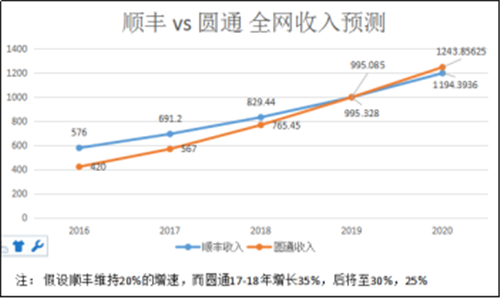順豐全網(wǎng)收入份額一度達20%。但隨著增速落后逐年下滑,很可能要失去老大地位。圓通申通單票運費是順豐的1/2,只要件量是順豐的2倍。就有可能超過順豐。2016年2月圓通老板娘張小娟在杭州兩會上透露圓通2015年總件量約35億件(實際30億票),全網(wǎng)營收350億元(實際可能為300億元)。根據(jù)圓通發(fā)布的業(yè)績預(yù)告,2016年件量和收入都大于40%的增長。全網(wǎng)收入可能超420億元。假若保持這種趨勢下去,圓通甚至中通、申通等都可能在接下來三五年內(nèi)在全網(wǎng)收入上超越順豐, 甚至比順豐提早突破千億大關(guān)。順豐可能掉至三四名甚至更后。