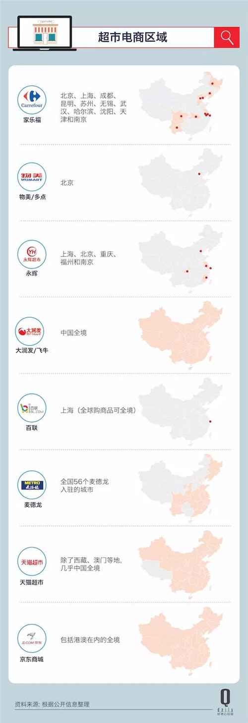 需要說明的是我們排除了排在第二的華潤(rùn)萬家(6.2%),和第三的沃爾瑪(4.9%),因?yàn)榍罢叩摹癳萬家”幾乎形同虛設(shè),而“網(wǎng)上沃爾瑪”一開始就是 1 號(hào)店,而且它現(xiàn)在也已經(jīng)歸屬京東了。而在考慮到主營(yíng)業(yè)務(wù)本來是企業(yè)客戶的麥德龍的個(gè)體消費(fèi)者業(yè)務(wù)不斷增長(zhǎng)的情況下,我們?cè)谠u(píng)測(cè)中加入了麥德龍。