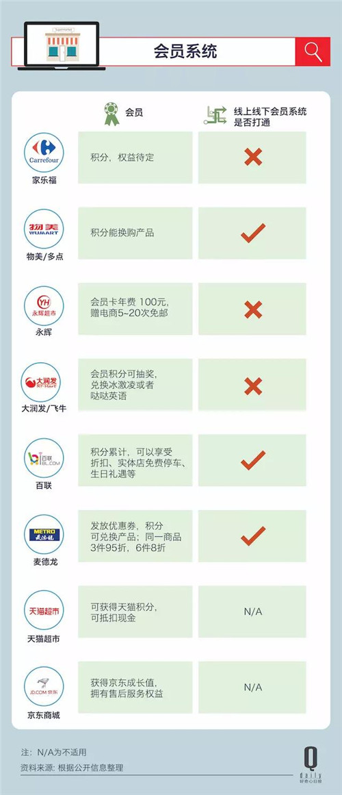 另外永輝、家樂福以及飛牛網(wǎng)(網(wǎng)上大潤(rùn)發(fā))的線上線下會(huì)員體系都沒有打通。如果是打算做客群來留住消費(fèi)者,打通會(huì)員體系還是比較重要的。