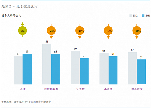 麥肯錫數(shù)據(jù)顯示,碳酸飲料、冰激凌、西式快餐等消費(fèi)人群占比均有下降,而果汁的消費(fèi)人群占比則有小幅提升。