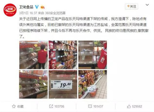 衛(wèi)龍表示,已在全國范圍從樂天瑪特渠道下架自家產(chǎn)品,斷絕與樂天的合作關(guān)系,并稱“民族的終歸是民族的,撤就撤了”。
