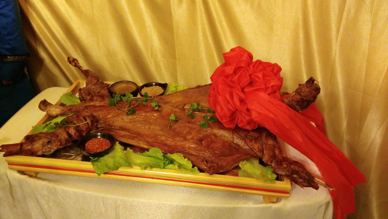 只一道烤全羊,酒店大廚都頗費(fèi)工夫。食材精選肉質(zhì)鮮嫩的鮮羊,肉質(zhì)均勻。因?yàn)閷?duì)“原汁原味”的極致追求,整只羊需提前三個(gè)小時(shí)炭火慢慢烤制。烤全羊上席后,色澤金黃,表皮脆嫩,鮮香襲人,令人垂涎欲滴。此時(shí),酒店工作人員會(huì)為當(dāng)晚最尊貴的客人獻(xiàn)上哈達(dá),并邀請(qǐng)客人一起舉行“開(kāi)羊儀式”,在蒙古,這象征主人對(duì)朋友最誠(chéng)摯的祝福。