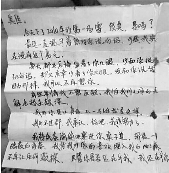 “2010年坐在16班教室里的那個(gè)叫美佳的學(xué)姐,你記得嗎?那年圣誕節(jié)下了場(chǎng)雪,曾經(jīng)有個(gè)學(xué)長(zhǎng)很愛(ài)你,五年以后我們?cè)谧雷涌p隙里找到了那個(gè)學(xué)長(zhǎng)給你的情書(shū)?!?/p>