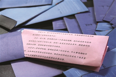 而最棘手則是一些父母與孩子之間有一些矛盾,“我們班一個(gè)男生因?yàn)楦咧袝r(shí)候爸媽管他管得太緊,以至于跟他們之間產(chǎn)生了很大的矛盾,他的父母知道有這樣一個(gè)可以給孩子寫(xiě)信的機(jī)會(huì)之后,雖然很高興,但是也憂(yōu)心忡忡,害怕孩子不愿意看他們的信,或者會(huì)因?yàn)檫@封信措辭不合適而加深對(duì)他們的誤解。我開(kāi)導(dǎo)了他們很久,他們才愿意寫(xiě)一封信,希望可以解開(kāi)這個(gè)心結(jié)?!标惱蠋煴硎荆@位同學(xué)的父母寫(xiě)的信更像是一封和解信,在字里行間的深深愧疚中,她也感受到了家長(zhǎng)對(duì)于孩子的無(wú)奈和那一顆期望孩子快樂(lè)的心。