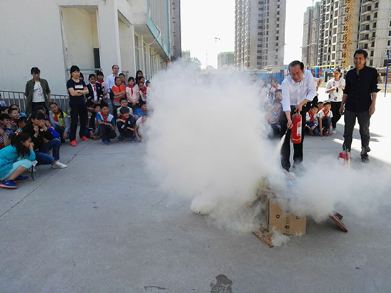 安全疏散演練完畢后,學(xué)校安全員為孩子們講解了校園防火、使用滅火器知識,以及火場逃生自救方法等消防安全常識,并現(xiàn)場指導(dǎo)師生干粉滅火器的使用方法。各班選出學(xué)生代表以及部分教師用滅火器進(jìn)行了現(xiàn)場滅火,參與活動的師生嚴(yán)格認(rèn)真地按照滅火方法進(jìn)行著操作,燃燒的“火魔”瞬間被“消防員”撲滅,場上觀看的師生報以熱烈的掌聲。
