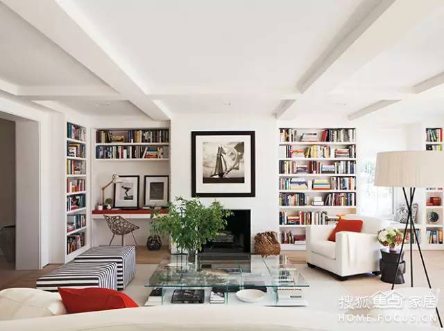 如果客廳有大落地窗,直接把客廳的沙發(fā)面向窗戶擺放。在窗戶前面擺放低矮的書(shū)架,看書(shū)看累了,就欣賞一下遠(yuǎn)方的風(fēng)景。