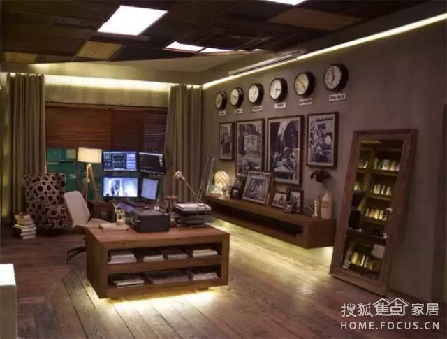 幾個(gè)沙發(fā)和壁爐圍在一起,看上去暖暖的。另外,壁爐也能起到輔助照明的作用。