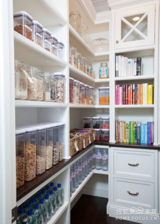 對于一個廚房,儲藏室面積是非常寶貴的,這里的貨架是原料的完美收納空間。瓶瓶罐罐全部擺放整齊,保持區(qū)域整潔,增加了廚房的樂趣。