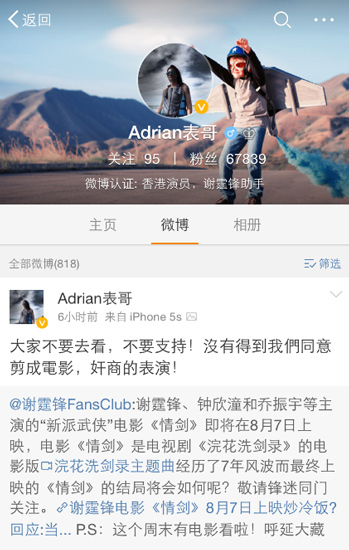那么,《情劍》的兩位“主演”謝霆鋒與鐘欣桐為什么沒(méi)來(lái)宣傳本片呢?馬云對(duì)此表示:“兩位演員都還有別的戲要拍,沒(méi)時(shí)間來(lái)宣傳我們的電影?!钡皫兹崭勖絾?wèn)及了兩人的經(jīng)紀(jì)人霍汶希,對(duì)方稱(chēng)《情劍》片方根本沒(méi)有通知他們上映的事,更沒(méi)有邀請(qǐng)二人宣傳。而在微博上認(rèn)證為“香港演員、謝霆鋒助手”的網(wǎng)友“Adrian表哥”也發(fā)微博指責(zé)片方并沒(méi)有得到謝霆鋒的同意,是奸商行為。另外,記者也查閱了《情劍》的官方微博,該官微在開(kāi)辦至今僅發(fā)7條微博,有90個(gè)粉絲??梢哉f(shuō),《情劍》除了一組有“抄襲嫌疑”的海報(bào)之外幾乎是在沒(méi)有任何宣傳的情況下推進(jìn)院線(xiàn)的。