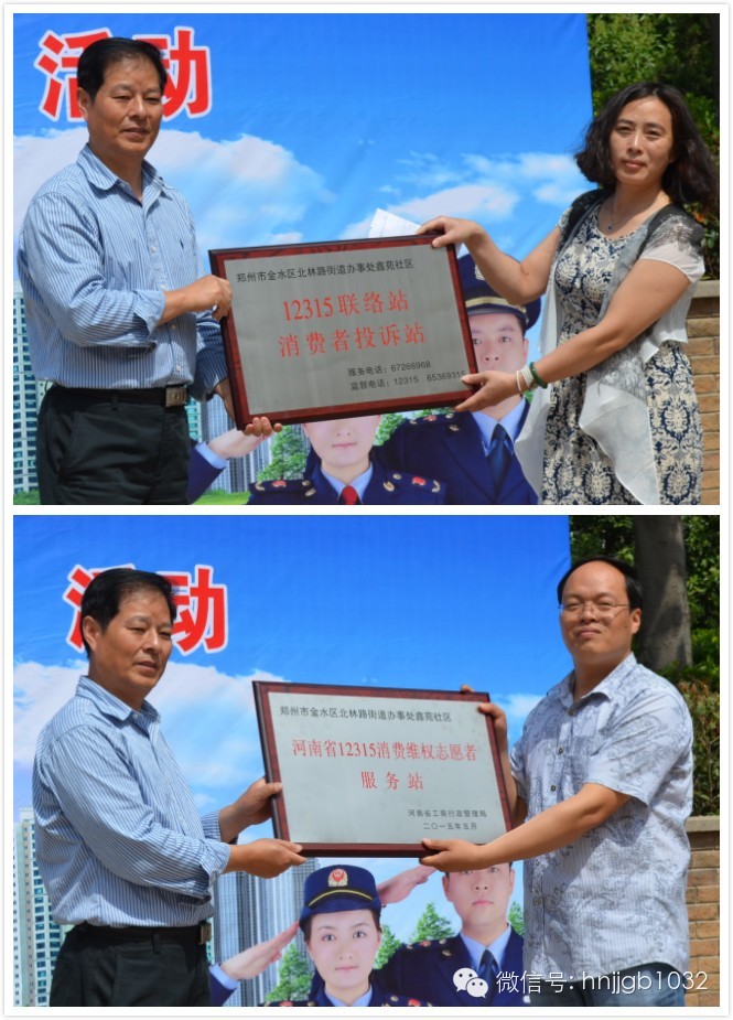 活動現場,省工商局趙中祥副局長還向鑫苑社區(qū)頒發(fā)了“12315聯(lián)絡站、投訴站”、“消費維權志愿者服務站”牌匾。