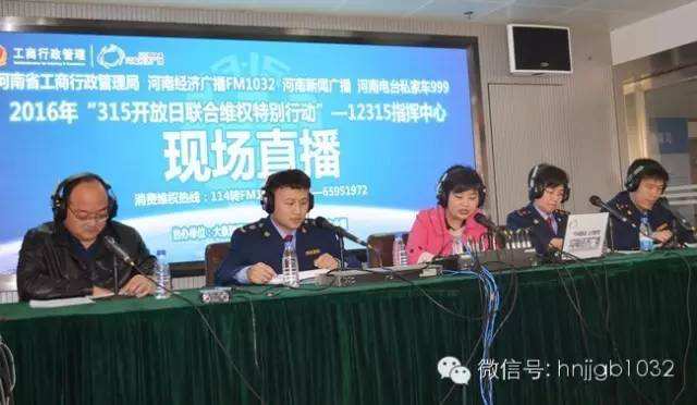 河南經(jīng)濟(jì)廣播在河南省工商局12315消費(fèi)者投訴舉報中心搭建直播室,河南經(jīng)濟(jì)廣播主持人依明和省工商局12315中心主任宋環(huán)英(右二)、省工商局12315消費(fèi)維權(quán)先鋒隊(duì)隊(duì)長鄭巖(左二)、省工商局企業(yè)信用信息監(jiān)管處副處長萬柳(右一)、河南經(jīng)濟(jì)廣播特約評論員李剛(左一)在直播現(xiàn)場。