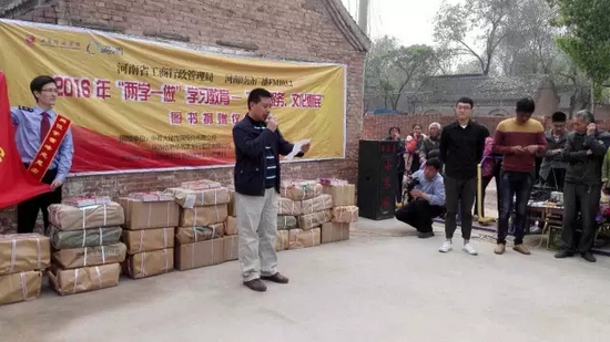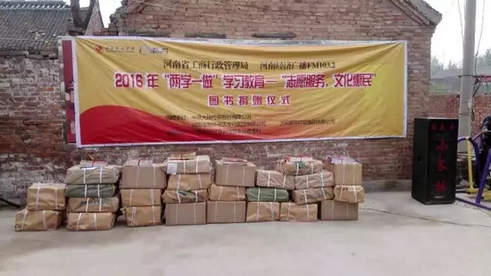 今天,河南省工商局聯(lián)合河南經(jīng)濟(jì)廣播FM1032開展“兩學(xué)一做”志愿服務(wù)文化惠民圖書捐贈(zèng)活動(dòng),來(lái)到封丘縣荊隆宮鄉(xiāng)孫蔡寨村。