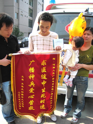 4月6日,在河南人民廣播電臺空中電波的幫助和協(xié)調(diào)下,衛(wèi)生、高速路政、交警等部門齊心協(xié)力,展開了一場挽救生命的接力大行動,信陽一名生命垂危的手足口病患兒王然得到了及時救助。經(jīng)過近一個月的精心治療,5月5日上午,王然康復(fù)出院,坐上了回家的列車。
