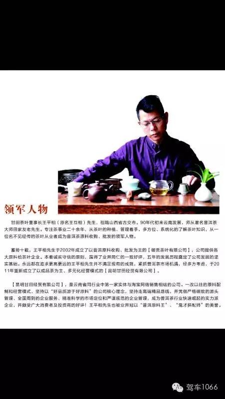 甘田茶葉董事長王互相先生,是近年來普洱茶領(lǐng)域的傳奇人物之一,從事普洱茶產(chǎn)業(yè)研究二十余年,積累并沉淀了豐厚的普洱茶知識和經(jīng)驗。長年累月地深入云南省的各大普洱茶產(chǎn)區(qū)調(diào)研,被業(yè)界冠以“普洱原料王”“鬼才拼配師”等美譽。王互相先生早年曾是國內(nèi)某大型普洱茶企業(yè)的高級管理人員,工作多年后,鑒于對普洱茶產(chǎn)業(yè)的獨到見解,成立了以原料收購和批發(fā)為主的“御貢茶葉”,為多家知名茶企提供原料支持地,深受業(yè)界好評,后經(jīng)十年發(fā)展,于2011年重新創(chuàng)建了以成品為主,多元化經(jīng)營模式的“昆明甘田經(jīng)貿(mào)有限公司”。