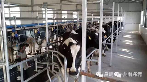 產(chǎn)奶期的奶牛從自己的牛舍成群結(jié)隊(duì)的有序步入擠奶廳,進(jìn)入擠奶廳后,每只奶牛都要先洗澡,然后人工擠掉前三把牛奶,裝好擠奶器,牛奶就從奶牛的體內(nèi)經(jīng)管道直接進(jìn)入冷藏罐了。我們可以站在觀(guān)景平臺(tái)上,透過(guò)高清玻璃,可以清楚的看到擠奶廳內(nèi)奶牛排隊(duì)擠奶的壯觀(guān)場(chǎng)景。