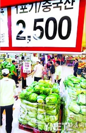 進入10月以來,作為韓國的“國菜”泡菜用的原料大白菜價格出現(xiàn)了暴漲的情況。在首爾,超市里一棵白菜的價格一度達到了1.5萬韓元(約合人民幣89元)。為了平抑菜價,韓國政府緊急從中國進口免關(guān)稅的大白菜救急。記者昨日在韓國首爾的樂天連鎖超市了解到,在每人限購3棵的情況下,中國大白菜在開業(yè)后30分鐘左右就已售罄,超市已決定從中國追加進口10萬棵白菜。