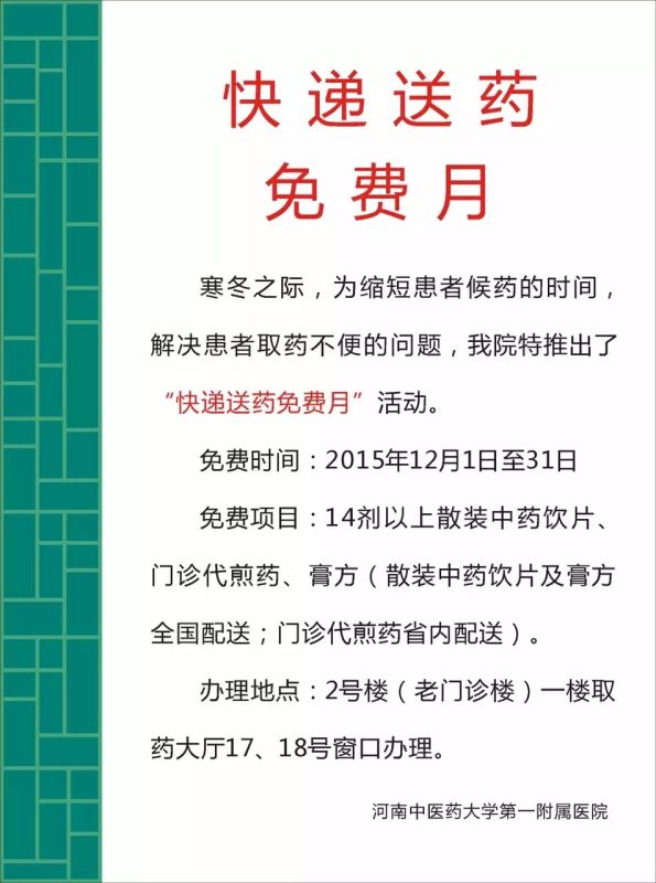 河南中醫(yī)學(xué)院第一附屬醫(yī)院藥學(xué)部—— 讓患者吃上道地好中藥即日起,該院推出“快遞送藥免費月”惠民活動。