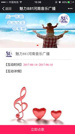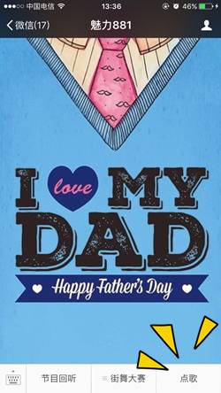 本周日就是父親節(jié)了。平時向爸爸們表達(dá)情意的機會可能不多,趁著節(jié)日,你可別落下。特意給親愛的老爸準(zhǔn)備了一份禮物,6月14日——6月16日,點擊菜單欄中的“點歌”或直接點擊本文底部的閱讀原文,進(jìn)入點歌互動頁后點擊“立即點歌”,填寫并提交姓名、手機號、所點歌曲名稱、以及你想對父親說的話。