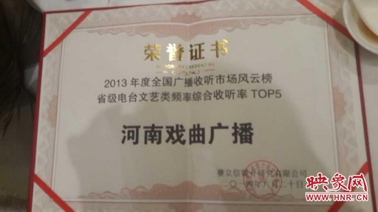 2014年8月20日晚上,國內(nèi)知名廣播收聽率調(diào)查公司賽立信媒介研究有限公司在成都舉行發(fā)布會(huì),授予河南電臺(tái)戲曲廣播娛樂976“2013年度全國廣播收聽率TOP5”榮譽(yù)稱號(hào)。