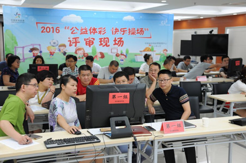 評(píng)審工作分四組進(jìn)行,每組評(píng)審人員首先對(duì)報(bào)名學(xué)校提供的基本情況進(jìn)行逐項(xiàng)了解,同時(shí),通過學(xué)校提供的校園、現(xiàn)有操場(chǎng)、器材室等實(shí)景照片,對(duì)是否提供捐贈(zèng)進(jìn)行綜合打分。最后由工作人員對(duì)每組評(píng)委的打分進(jìn)行匯總,按照每所學(xué)校得分高低進(jìn)行排序,前25名的學(xué)校入圍2016“公益體彩 快樂操場(chǎng)”(河南)實(shí)地考察名單。