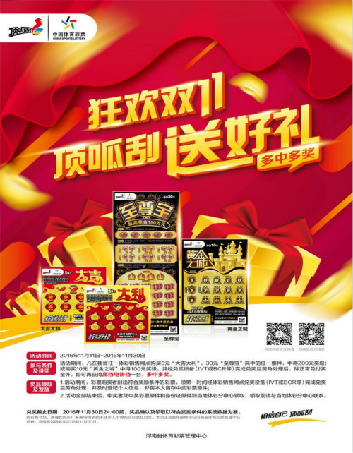 激情綻放十一月,愉悅驚喜帶回家!給力鉅惠超劃算,盡在體彩“頂呱刮”!活動(dòng)詳情請(qǐng)咨詢(xún)?nèi)「黧w彩銷(xiāo)售網(wǎng)點(diǎn)。