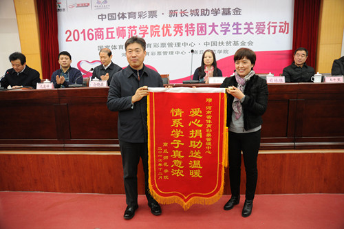 2016年12月7日、8日,中國體育彩票品牌公益項(xiàng)目“中國體育彩票新長城助學(xué)基金”2016年捐贈(zèng)儀式分別在商丘師范學(xué)院和周口師范學(xué)院舉行。據(jù)悉,通過此次捐贈(zèng)活動(dòng),河南省體育彩票管理中心共向兩個(gè)學(xué)校來自全國14省區(qū)的120名優(yōu)秀貧困大學(xué)生每人捐助5000元,幫助他們和他們的家庭,減輕學(xué)習(xí)生活中的經(jīng)濟(jì)負(fù)擔(dān)。