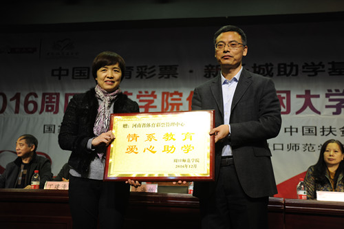 與會(huì)領(lǐng)導(dǎo)向周口師范學(xué)院受助學(xué)生代表發(fā)放5000元助學(xué)金