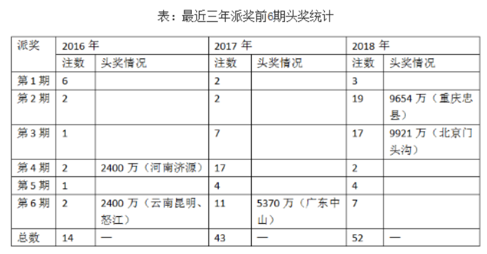 今年的“6億元大派獎”,前3期即爆出2個近億元大獎,獎金分別高達9654萬、9921萬元。前6期頭獎數(shù)量則達到了52注。