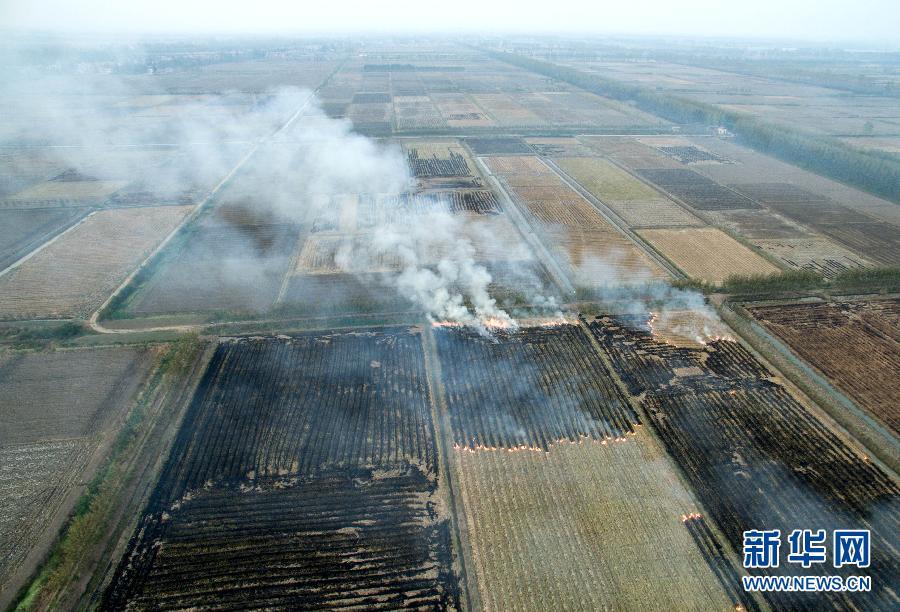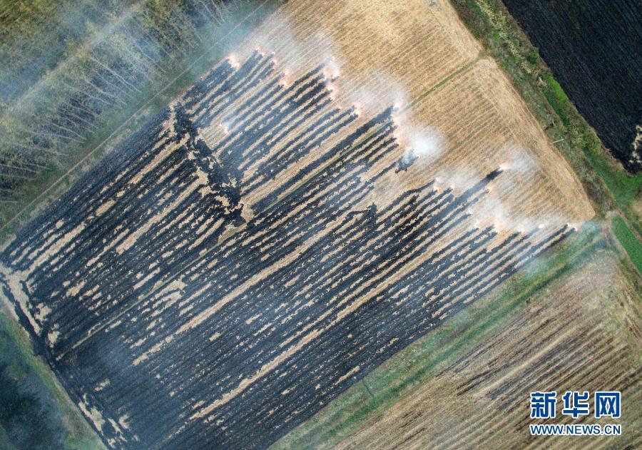 這是用無人機拍攝的湖北省潛江市一處秸稈焚燒火點(10月21日攝)。