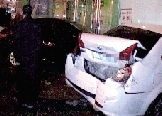 轎車(chē)半夜下橋太快連撞三車(chē) 一輛車(chē)被撞進(jìn)路邊店鋪