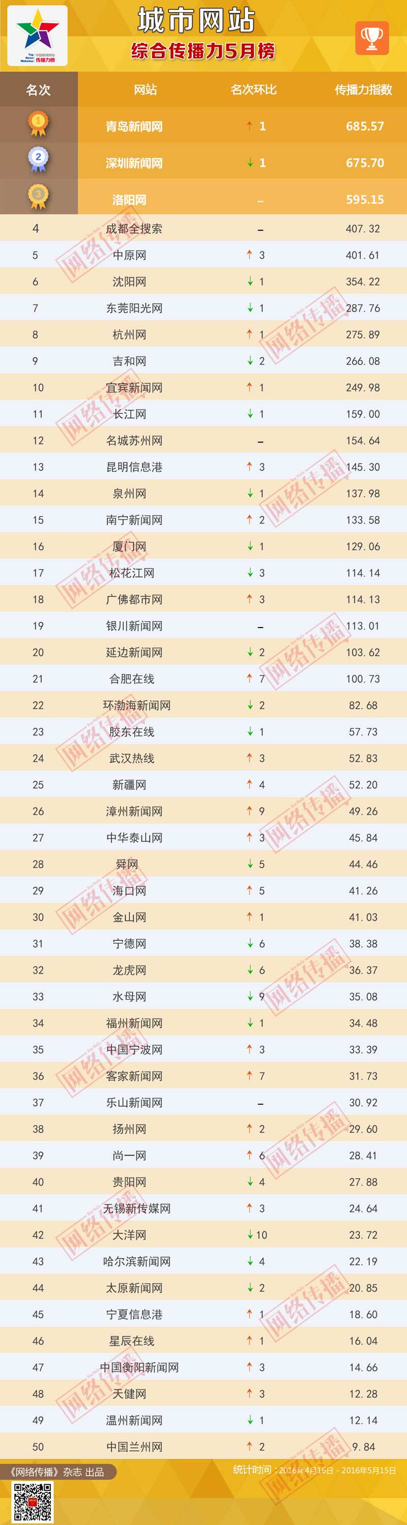 中央網信辦《網絡傳播》雜志傾力打造的“城市網站傳播力2016年5月榜”今日正式發(fā)布。榜單顯示,青島新聞網、深圳新聞網、洛陽網位列綜合傳播力榜前三甲;青島新聞網、深圳新聞網、成都全搜索位居PC端傳播力榜前三名;兩微傳播力榜前三名分別是洛陽網、中原網、成都全搜索。