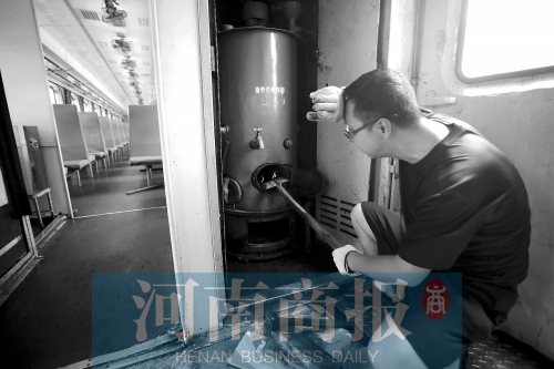 7月28日,新鄉(xiāng)最高氣溫36℃。下午1點(diǎn)30分,河南商報(bào)記者進(jìn)入車(chē)廂,車(chē)廂內(nèi)溫度計(jì)顯示44℃。這個(gè)時(shí)候,供水員李波和王旭陽(yáng),已經(jīng)在車(chē)上工作了1個(gè)多小時(shí)。當(dāng)河南商報(bào)記者走近茶爐時(shí),甚至能感覺(jué)到毛孔在一瞬間“炸開(kāi)”。作為上車(chē)最早的茶爐工,他們中午12點(diǎn)就要上車(chē),找劈柴、點(diǎn)火、燒水,將每個(gè)硬座車(chē)廂的保溫桶和全車(chē)66個(gè)暖瓶灌滿。2014年綠皮車(chē)相繼淘汰,自此再?zèng)]專(zhuān)人提供用于燃煤茶爐點(diǎn)火的劈柴,全靠供水工自己找尋。