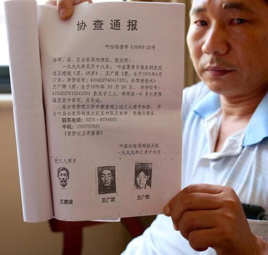 8月21日,河南平頂山,遇害兒童王龍龍的父親王偉,向記者展示當(dāng)年葉縣警方發(fā)布的協(xié)查通報(bào)。從29歲追到47歲,王偉不僅要替兒守尸,還要漫無目的地追兇,任何線索也沒發(fā)現(xiàn)。當(dāng)初被警方通緝的4個(gè)嫌疑人,有3人已回鄉(xiāng)多年,因證據(jù)不足,他們已恢復(fù)自由。