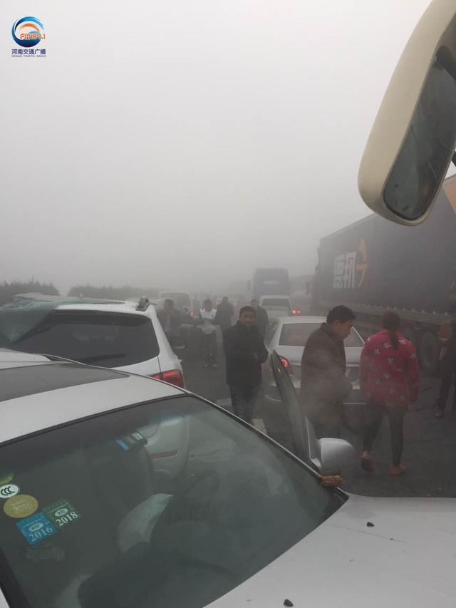 據(jù)現(xiàn)場郭先生描述:大概有4輛貨車,1輛中巴車,4輛私家車連環(huán)追尾,他就在這幾輛事故車后方,當時受大霧影響,能見度50米左右,前方堵車,結果這幾輛車都沒剎住,直接相繼撞上了,郭先生說“幸虧當時我車速不算快,及時把車剎住,不然前方就是一輛貨車,撞上去的話后果不堪設想,現(xiàn)在我的手都是抖的,太恐怖了”