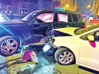 車禍發(fā)生時,已是2月15日的凌晨4時許,在紫荊山路與東大街交叉口,發(fā)生碰撞的兩輛車為一輛大眾Polo轎車和一輛奔馳GLK越野車。大眾轎車攔腰撞上奔馳車,兩車均受損嚴重變形。