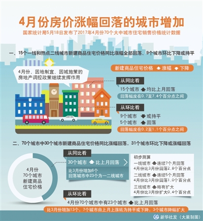 國(guó)家統(tǒng)計(jì)局城市司高級(jí)統(tǒng)計(jì)師劉建偉解讀稱,從環(huán)比看,4月份70個(gè)城市中有23個(gè)城市新建商品住宅價(jià)格漲幅比上月回落,比3月份增加13個(gè);7個(gè)城市由上月上漲轉(zhuǎn)為持平或下降;3個(gè)城市房?jī)r(jià)降幅擴(kuò)大。