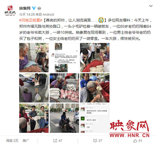 映象網(wǎng)快訊(記者 王寬 趙輝 實習生 張璨榮 文/圖)“我能想到最浪漫的事,就是和你一起慢慢變老……”8月23日中午,鄭州街頭上演暖心一幕,年過八旬的中牟老農(nóng)趕著毛驢車拉著老伴進城賣大蒜,一車蒜被搶購一空,卻裝滿了鄭州愛心市民送的食物。