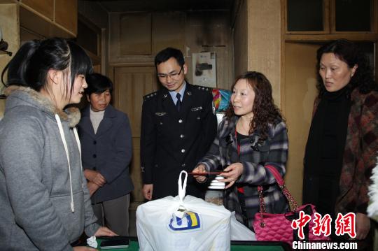 圖為浙江臺州椒江警方于28日到李某親屬家中探望正處于康復期的“帶毒”小嬰兒,并送上愛心捐款和奶粉等慰問品。