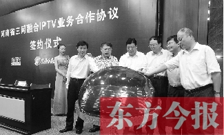 省委副書記、省長謝伏瞻發(fā)來賀信,向河南IPTV業(yè)務(wù)三方合作協(xié)議成功簽署表示熱烈祝賀。副省長張廣智,省委宣傳部副部長、省廣電局局長趙景春,省委宣傳部副部長、河南日報(bào)報(bào)業(yè)集團(tuán)董事長、社長朱夏炎,省工信廳廳長王照平,省通信管理局局長宋靈恩,中國網(wǎng)絡(luò)電視臺總經(jīng)理、愛上電視傳媒有限公司董事長汪文斌,河南電視臺臺長王少春共同出席了簽約儀式,宣告河南IPTV業(yè)務(wù)正式啟動。