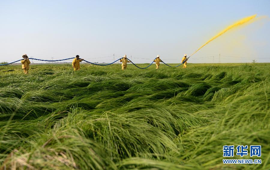 滅螺隊隊員扛著150米的皮管對重點地區(qū)進行藥物滅螺(4月14日攝)。
