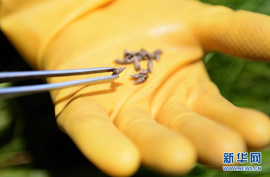 滅螺隊員在查看收集到的釘螺(4月14日攝)。 新華社記者 萬象 攝