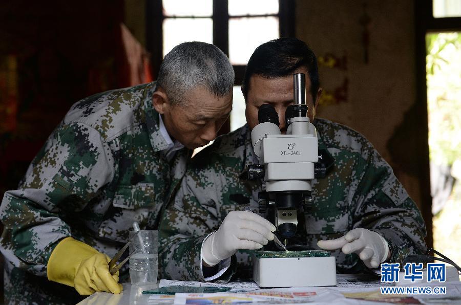 在租住當?shù)剞r(nóng)民的房子里,滅螺隊員熊林根(右)用顯微鏡觀察當天收集的釘螺樣本(4月14日攝)。 新華社記者 萬象 攝