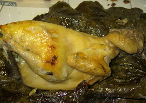 先將雞去腳爪肋下取臟,將腿、翅、頸骨入壇,加醬油、紹酒、精鹽腌漬一小時,取出,將丁香、八角碾末,加山奈遍抹雞身,炒鍋入熟豬油,炸蔥、姜起香后撈去,再將蝦仁,雞肫丁、香菇丁、豬肉、火腿丁、蝦米入炒鍋顛炒幾下,加紹酒、醬油、白糖炒至斷生,待涼后塞入雞腹,放丁香并用豬網(wǎng)油包緊雞身,外用鮮荷葉包裹數(shù)層用細麻繩扎緊,把酒壇泥碾成粉加清水拌和起粘平攤濕布上,把雞置泥中間用濕布兜起,使泥緊粘揭去濕布,用包裝紙包裹,再戳一小孔,將雞裝入烤箱,旺火烤約40分鐘取出,用濕酒壇泥封孔再烤半小時,用小文火烤80分鐘,再用微火烤90分鐘,取出敲去泥,去強,荷葉裝盤,淋芝麻油即成。