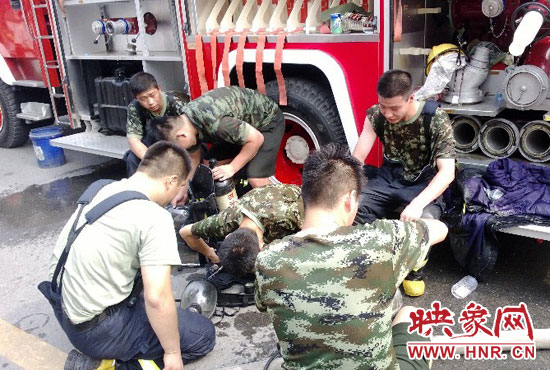 由于天氣炎熱,加上接近火災(zāi)現(xiàn)場(chǎng)、救援時(shí)間長(zhǎng),多名消防戰(zhàn)士虛脫暈倒,現(xiàn)場(chǎng)注射和飲用生理鹽水,附近商戶也為消防戰(zhàn)士送來飲用水。