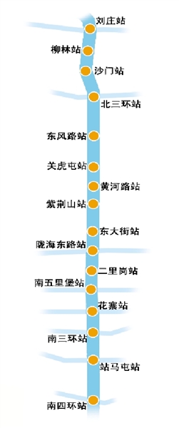 地鐵2號(hào)線為城市南北向軌道骨干線,其中一期工程起于劉莊站,止于南四環(huán)站,設(shè)車(chē)站16座,線路長(zhǎng)20.6公里,沿花園路、紫荊山路敷設(shè)。
