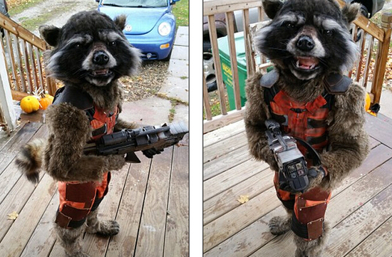 據(jù)悉,這件套裝仿照電影《銀河護(hù)衛(wèi)隊》里的漫畫角色“火箭浣熊”制作而成。該電影的導(dǎo)演詹姆斯·古恩(James Gunn)在網(wǎng)上看到后贊譽有加,稱“又一件超酷的萬圣節(jié)服飾,大家真的是棒極了!”