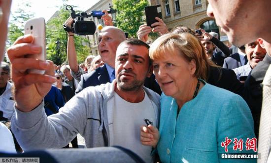 資料圖:柏林的一處難民營(yíng)外,一位移民拿起手機(jī)與默克爾自拍合影。