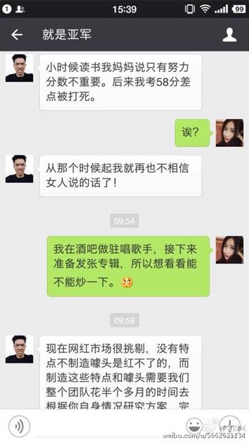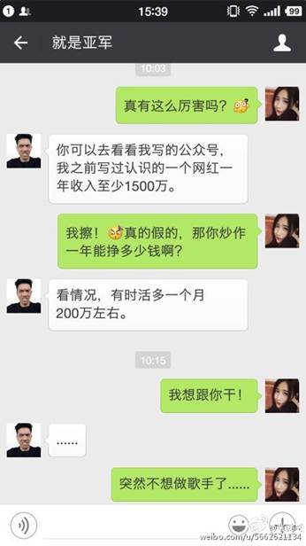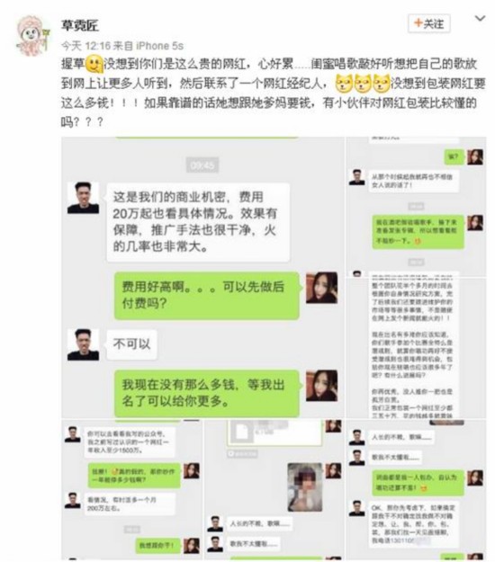 6月6日,某酒吧駐唱女歌手通過(guò)自己的微博發(fā)布了幾張聊天截圖。截圖內(nèi)容也是著實(shí)讓大家大吃一驚。聊天內(nèi)容大意是酒吧駐唱女歌手找了一位可以網(wǎng)紅經(jīng)紀(jì)人,期望他能夠把自己炒成網(wǎng)絡(luò)紅人,而每次推成功一次紅人,大概費(fèi)用至少是20萬(wàn)起。該網(wǎng)紅經(jīng)理自稱打造網(wǎng)紅每月收入百萬(wàn)。